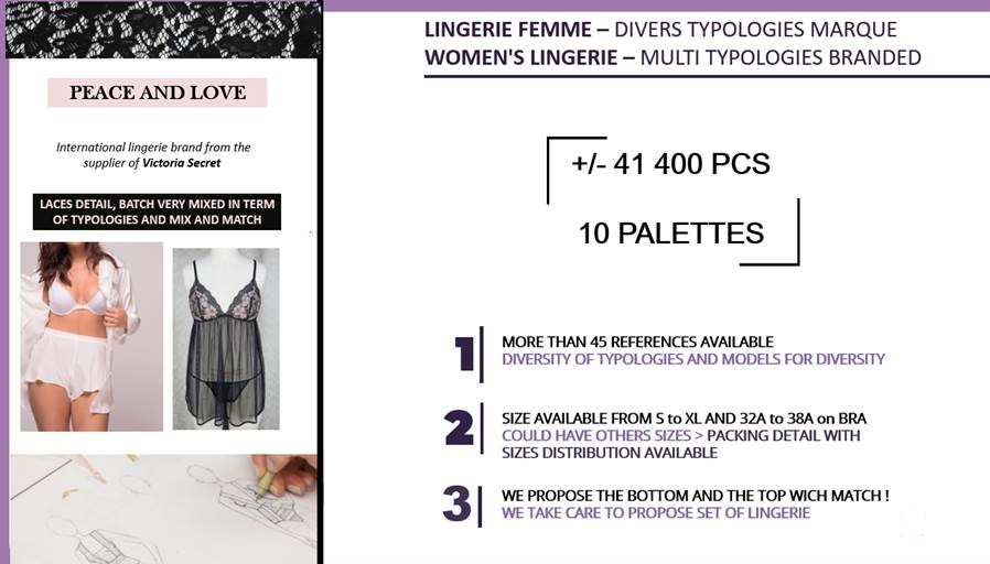 WOMEN'S LINGERIE – MULTI TYPOLOGIES BRANDEDTotal: 41 400 pcs. / 10 palletsPrice take all: 1.05€ pcs.EXW Europe