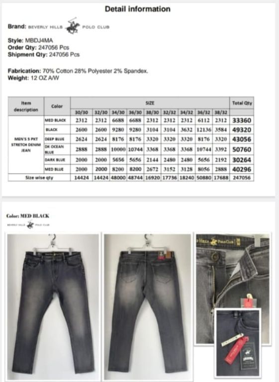 Beverly hills Polo club JeansTotal: 247 056 pcs.Price take all: 6.75$ pcs.EXW: NJ, USA