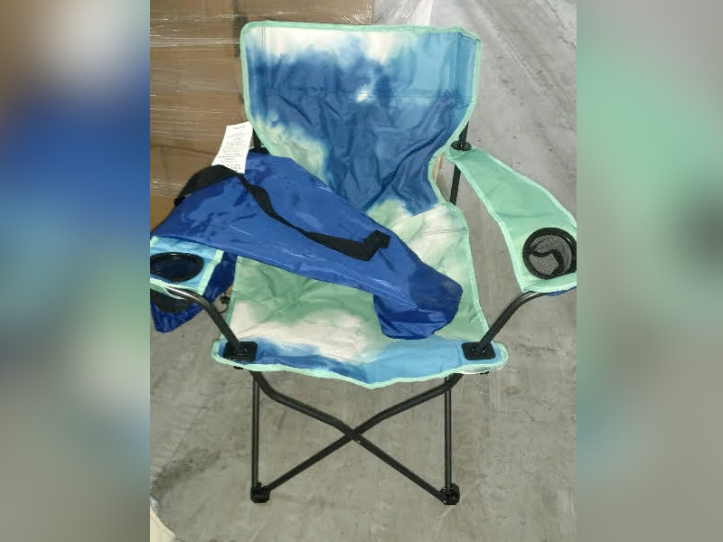 Made of sturdy 600D Polyester with a 300-pound weight limit. Features a mesh cup holder on each arm and a carrying bag with drawstring and carrying strap.